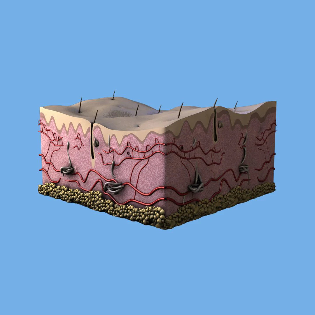 - Subcutaneous tissue (fat) – the bottom layer. This protects your bones and muscles, helps regulate body temperature, and acts as a passageway for nerves and blood vessels from the dermis to the muscles.