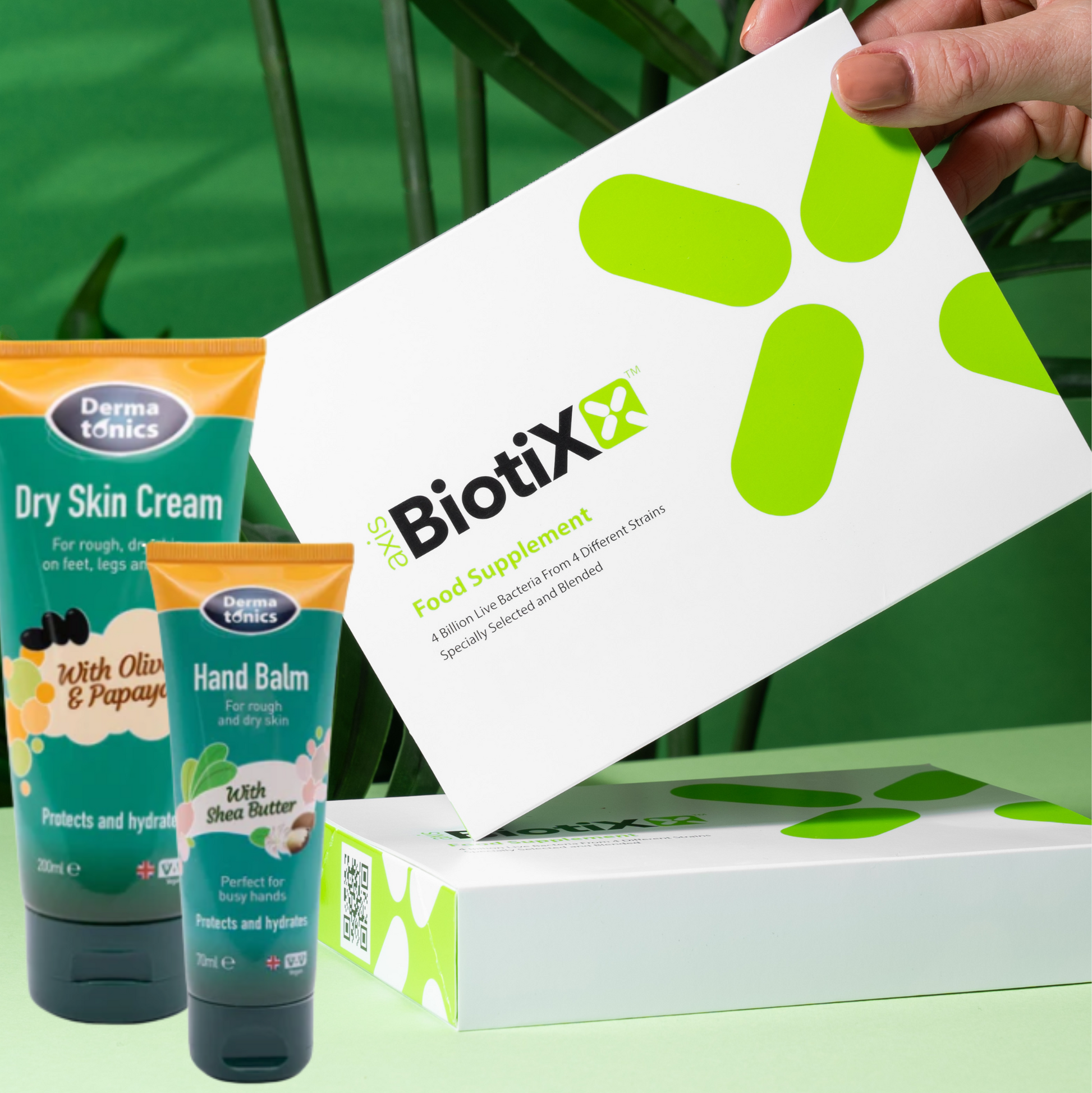 Each sachet contains 4 billion live bacteria, from four different strains, specifically selected by Dr. Catherine O’Neill, to address the high levels of two pro-inflammatory chemicals found in the body known as Interleukin- 17 and Interleukin-23. They also help to strengthen the gut barrier, which has been shown in some studies conducted in people with psoriasis to be a little bit ‘leaky’. By doing this, our supplement aims to reduce inflammation and help support most of the skin symptoms of psoriasis, such as redness, itchiness, flaky skin, and dryness.