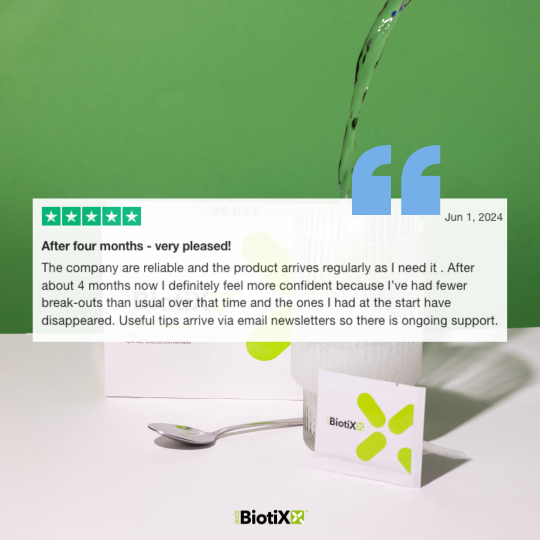 Each sachet contains 4 billion live bacteria, from four different strains, specifically selected by Dr. Catherine O’Neill, to address the high levels of two pro-inflammatory chemicals found in the body known as Interleukin- 17 and Interleukin-23. They also help to strengthen the gut barrier, which has been shown in some studies conducted in people with psoriasis to be a little bit ‘leaky’. By doing this, our supplement aims to reduce inflammation and help support most of the skin symptoms of psoriasis, such as redness, itchiness, flaky skin, and dryness.